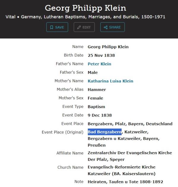 Georg Philipp William Klein was born on November 25, 1838 in Bad Bergzabern, Südliche Weinstraße, Rhineland-Palatinate, Germany. He and