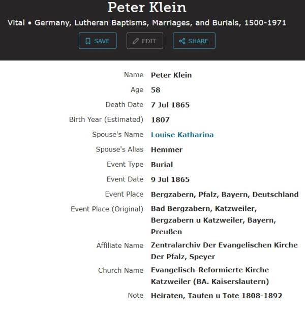 Family: Peter Klein Born: 1807, Died: July 7, 1865