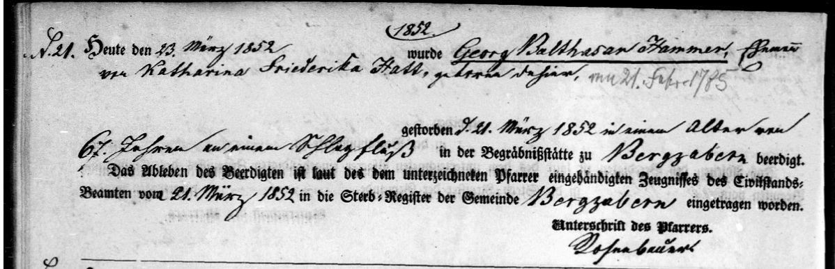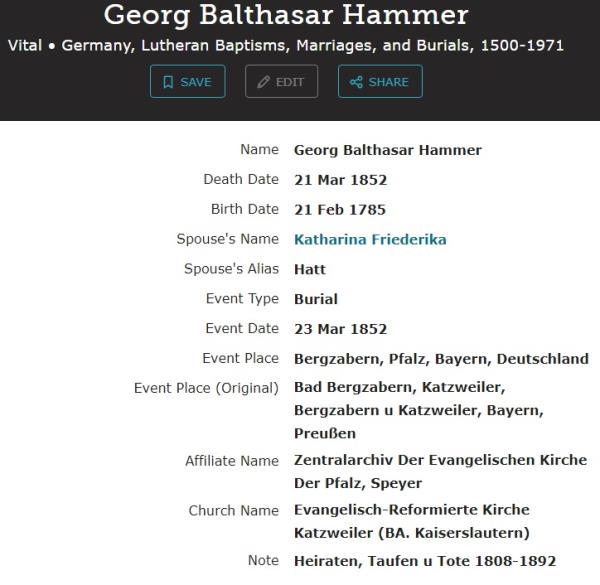 Georg Balthasar Hammer was born on February 21, 1785 in Bad Bergzabern, Südliche Weinstraße, Rhineland-Palatinate, Germany. He and