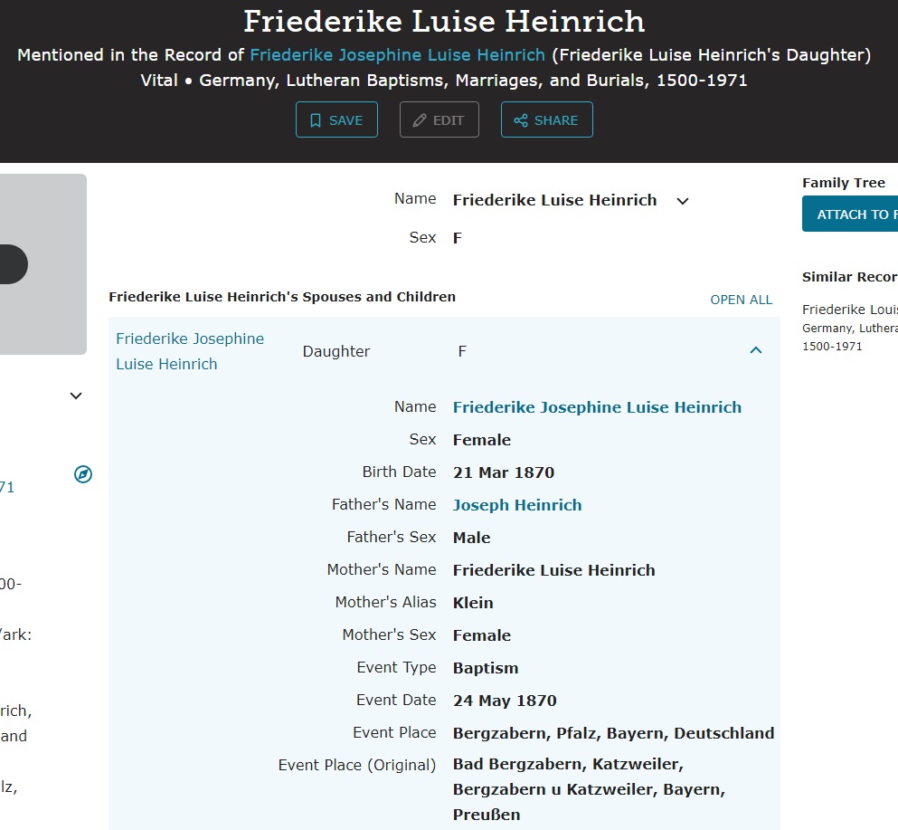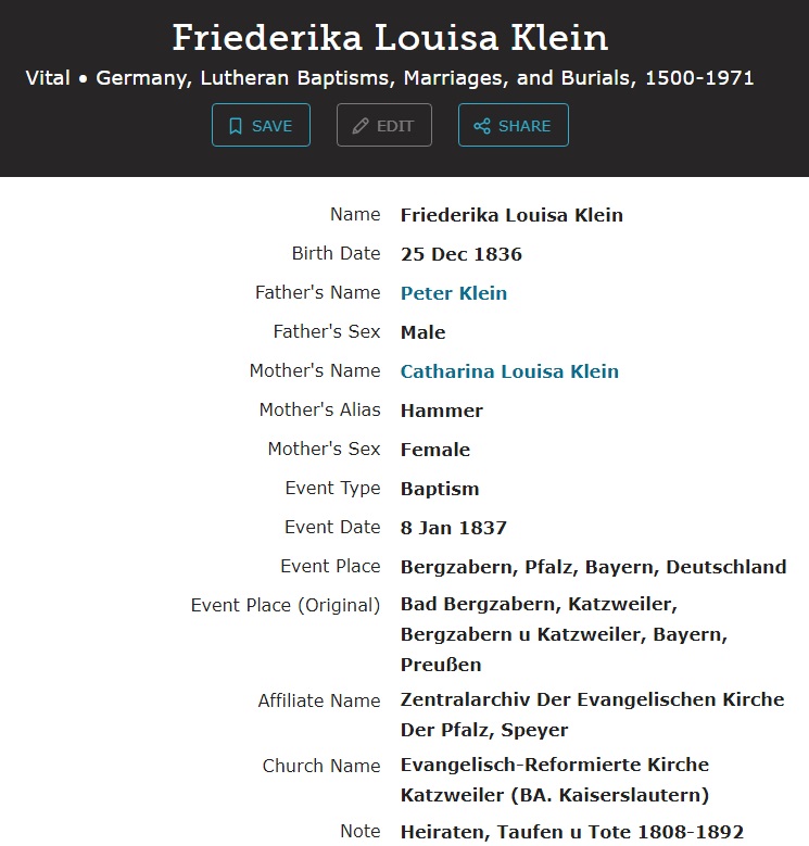 Friederika Louisa Klein was born on December 25, 1836 in Bad Bergzabern, Südliche Weinstraße, Rhineland-Palatinate, Germany. She and