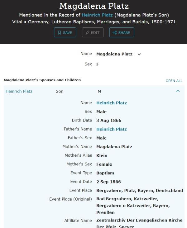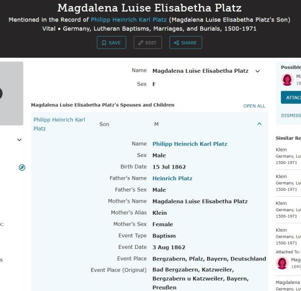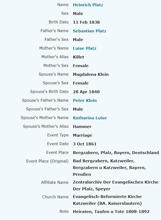 Heinrich Platz were married on October 3, 1861 in Bad Bergzabern, Südliche Weinstraße, Rhineland-Palatinate, Germany. She died.