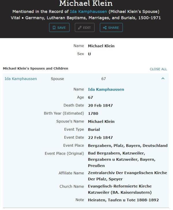 Michael Klein were married. She died on February 20, 1847, at age ~67, in Bad Bergzabern, Südliche Weinstraße, Rhineland-Palatinate, Germany.