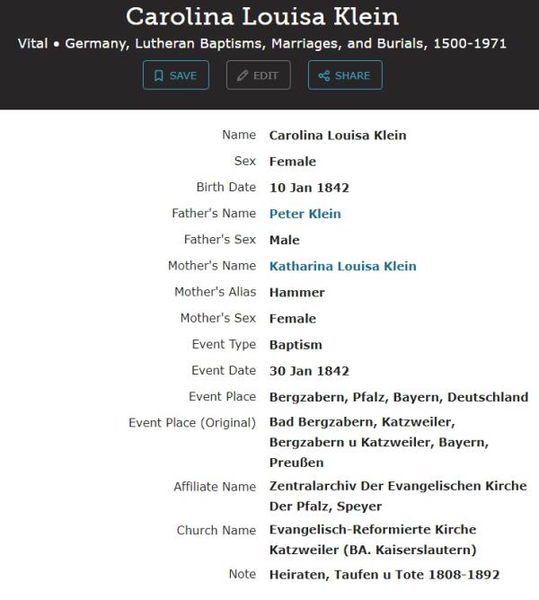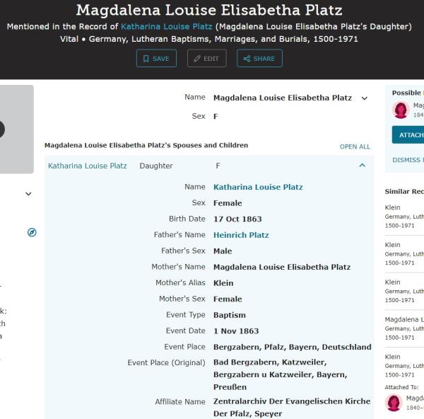 Magdalena Louise Elisabeth Klein was born on April 28, 1840 in Bad Bergzabern, Südliche Weinstraße, Rhineland-Palatinate, Germany. She and