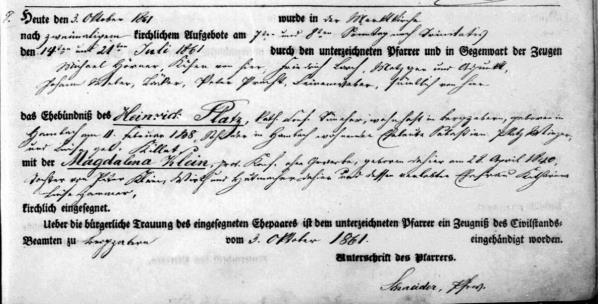Magdalena Louise Elisabeth Klein were married on October 3, 1861 in Bad Bergzabern, Südliche Weinstraße, Rhineland-Palatinate, Germany. He died.