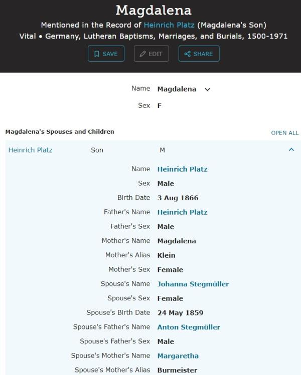 Henrich Platz were married on August 6, 1896 in Schwetzingen, Rhein-Neckar-Kreis, Baden-Württemberg, Germany. She died.