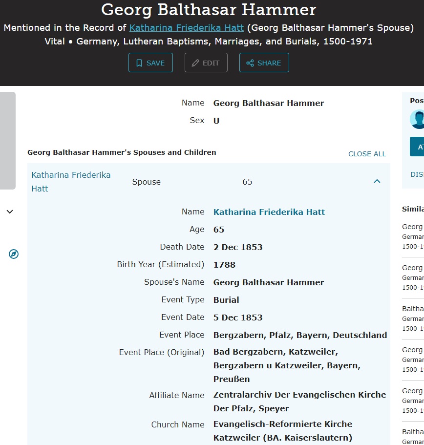 Georg Balthasar Hammer were married on April 8, 1813 in Bad Bergzabern, Südliche Weinstraße, Rhineland-Palatinate, Germany. She died on December 5, 1853, at age 65, in Bad Bergzabern, Südliche Weinstraße, Rhineland-Palatinate, Germany.