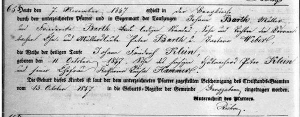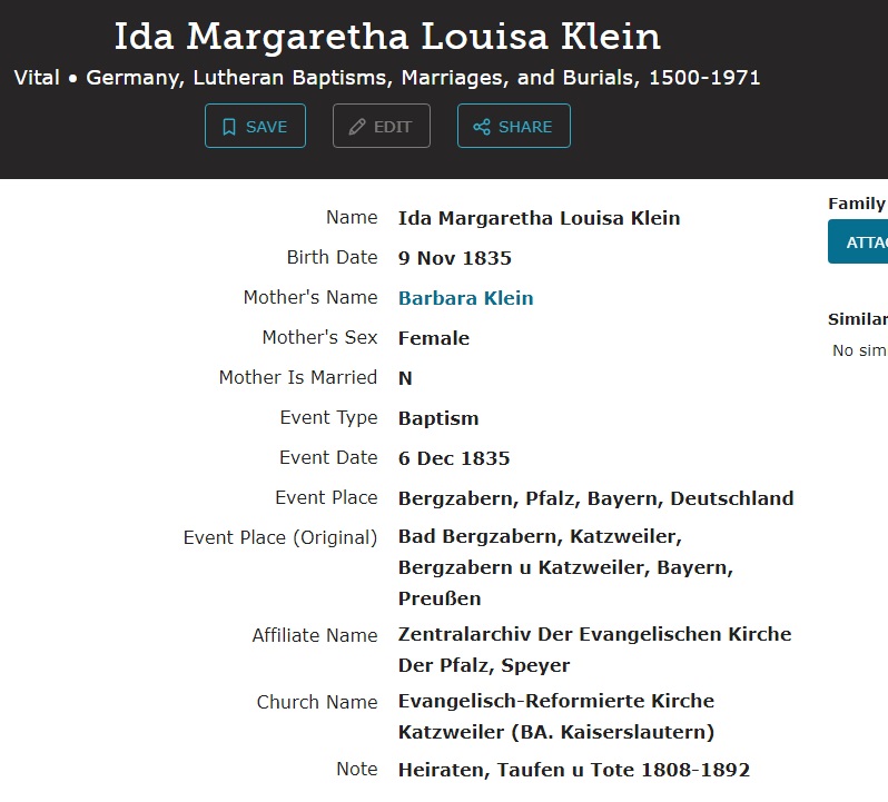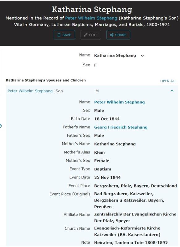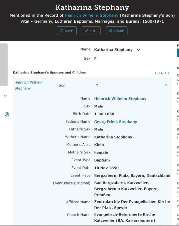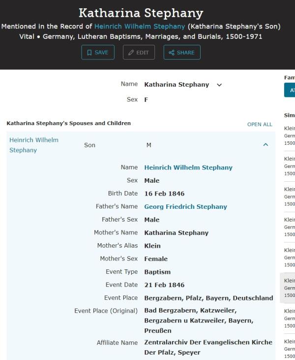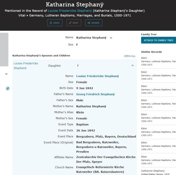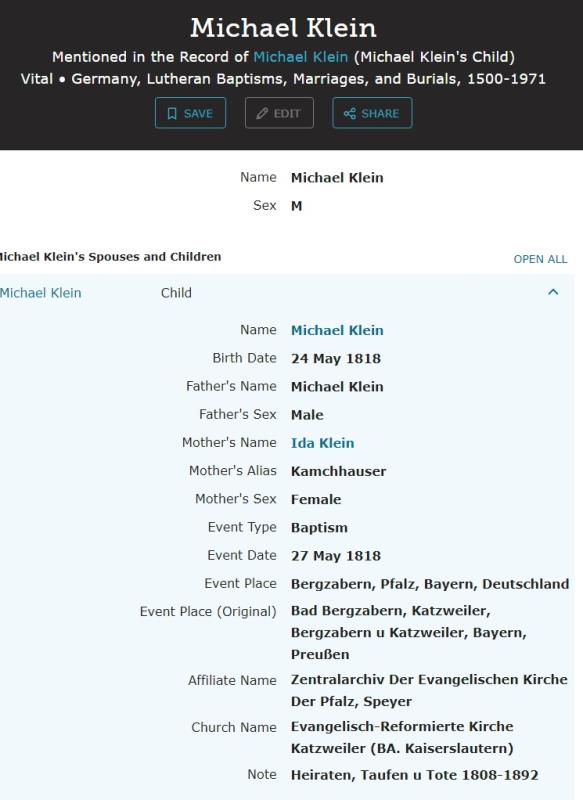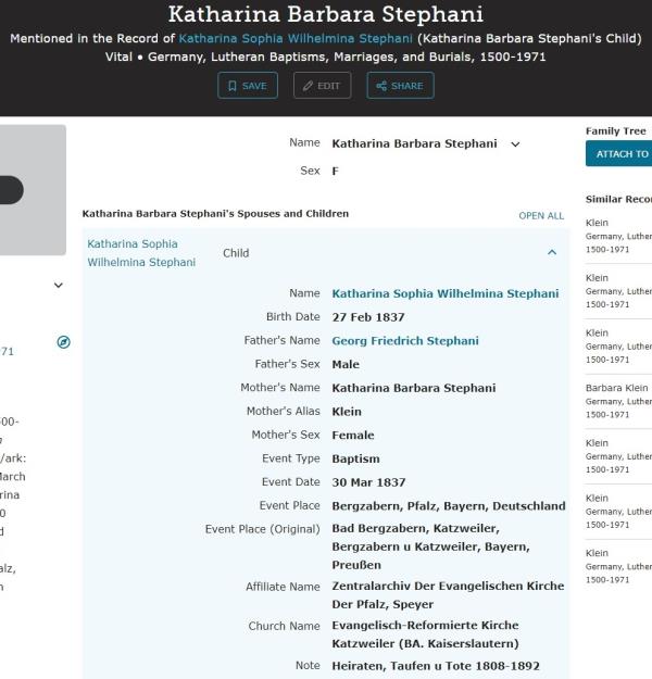 Katharina Barbara Klein were married on December 6, 1835 in Bad Bergzabern, Südliche Weinstraße, Rhineland-Palatinate, Germany. He died.
