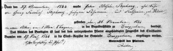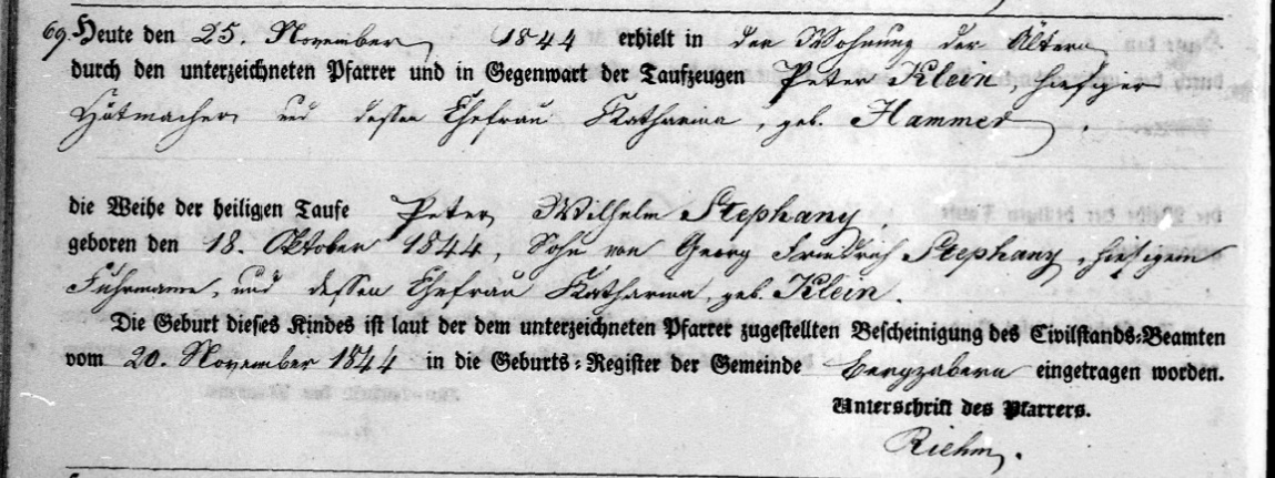 Peter Wilhelm Stephanÿ was born on October 18, 1844 in Bad Bergzabern, Südliche Weinstraße, Rhineland-Palatinate, Germany. He died on November 27, 1844, at age 0, in Bad Bergzabern, Südliche Weinstraße, Rhineland-Palatinate, Germany.