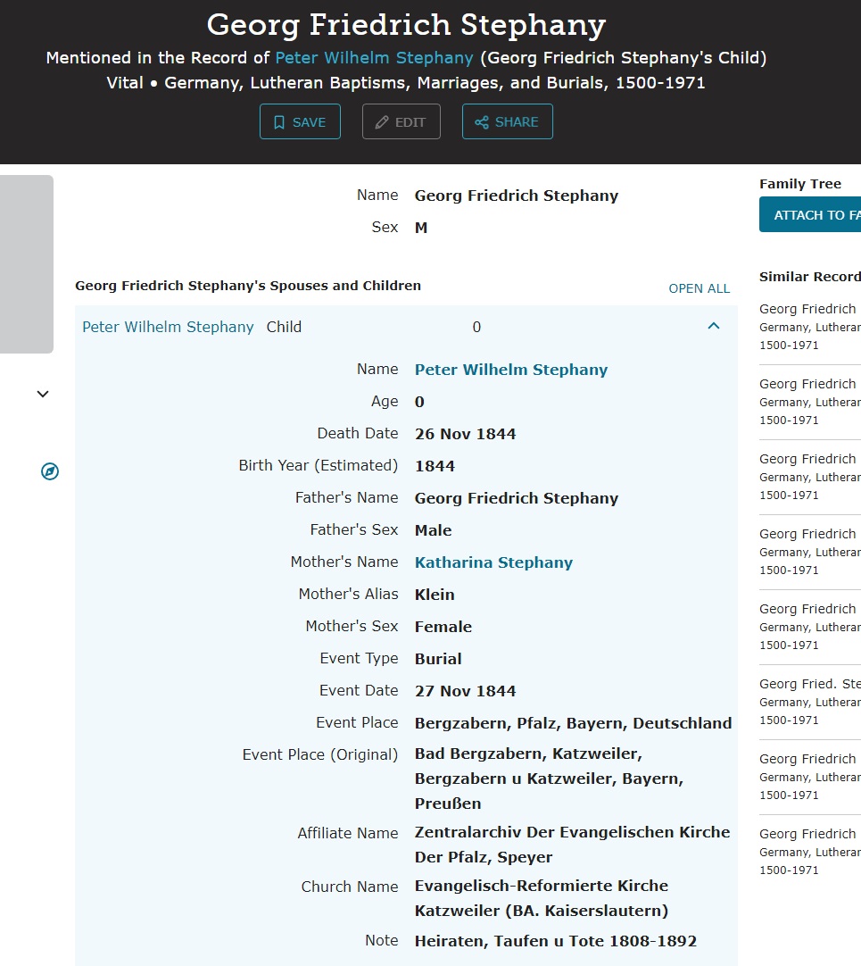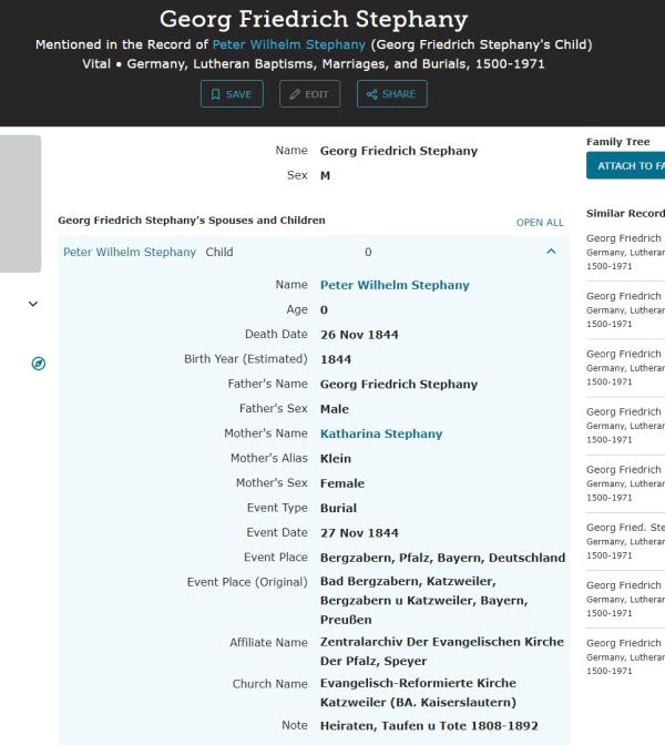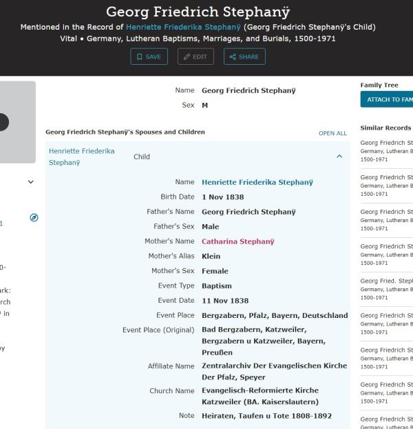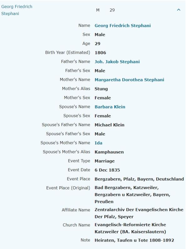 Georg Friedrich Stephanÿ were married on December 6, 1835 in Bad Bergzabern, Südliche Weinstraße, Rhineland-Palatinate, Germany. She died.