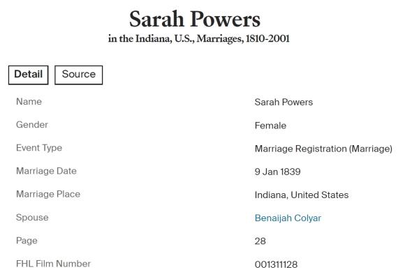 Sarah Powers was born on February 25, 1822 in Union City, Randolph, Indiana, USA. She and