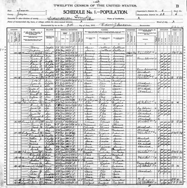 Colyer Family 1900 Federal Census Iowa, Lines 82-88