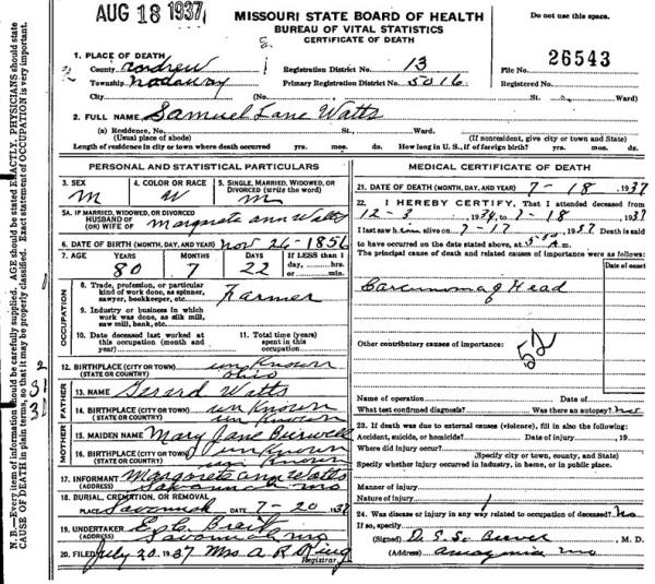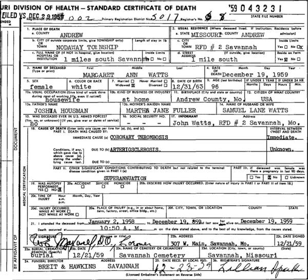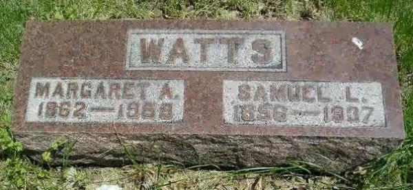 Samuel Lane Watts were married. She died on December 19, 1959, at age 95, in Nodaway, Andrew, Missouri, USA. She was buried in Savannah Cemetery, Savannah, Missouri.