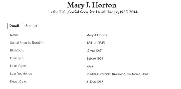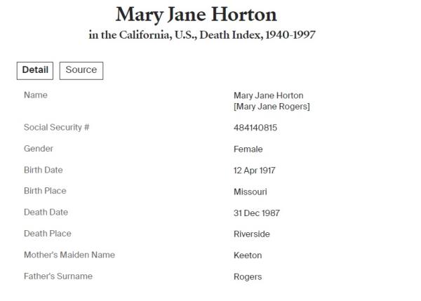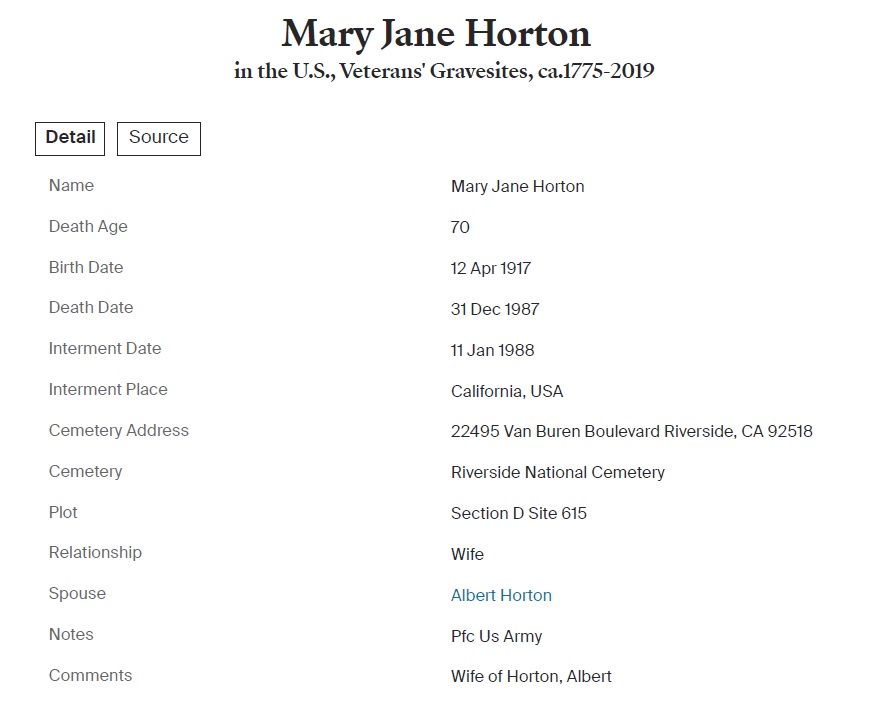 Albert Horton were married in 1942. She died on December 31, 1987, at age 70, in Riverside, Riverside, California, USA. She was buried in Riverside National Cemetery, Riverside, California.