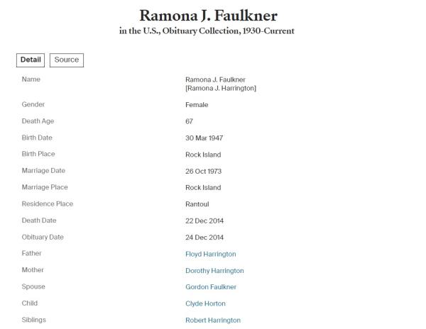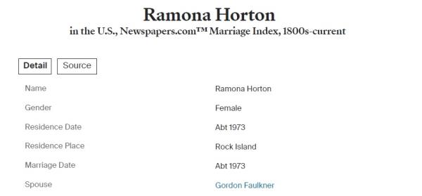 Gordon Faulkner were married on October 26, 1973 in Rock Island, Rock Island, Illinois, USA. She died on December 22, 2014, at age 67.