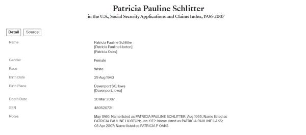 Patricia Pauline Schlitter was born on August 29, 1944 in Davenport, Scott, Iowa, USA. She and