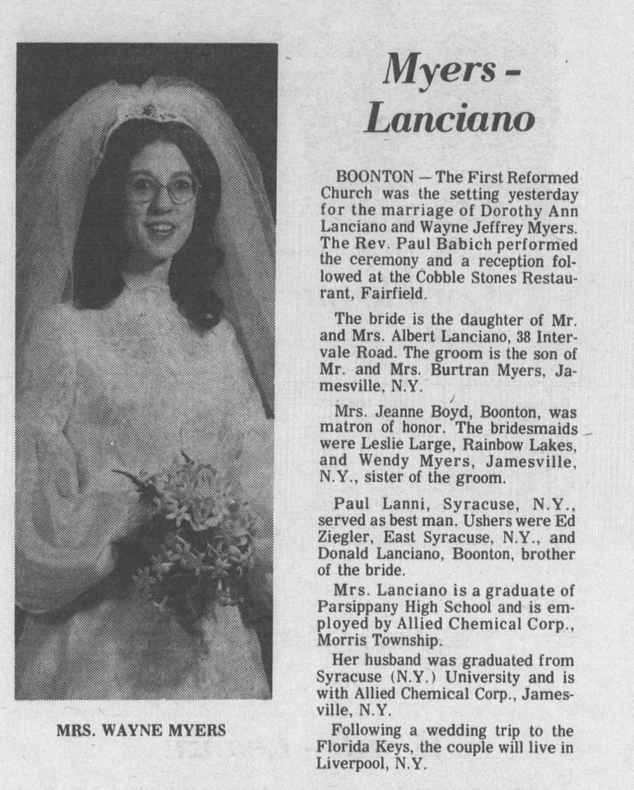 Wayne Jeffery Myers were married on February 15, 1975 in Boonton, Morris, New Jersey, USA. She and