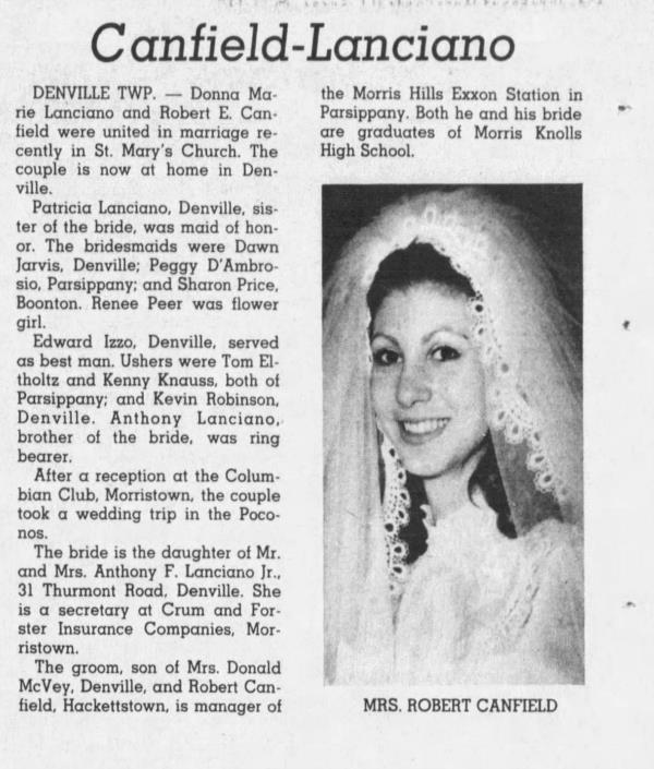 Robert E. Canfield were married in 1977 in Morris, New Jersey, USA.