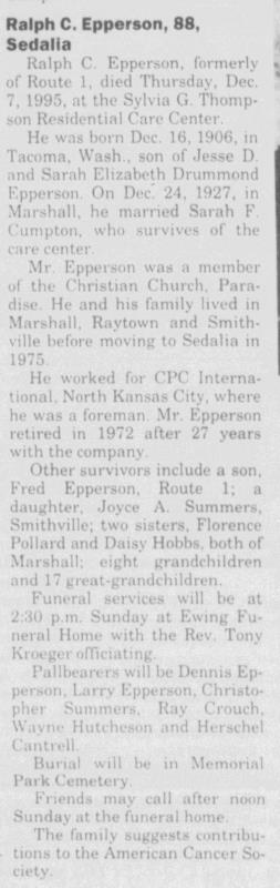 Sarah Frances Cumpton were married on December 24, 1927 in Marshall, Saline, Missouri, USA. He died on December 7, 1995, at age 88, in Sedalia, Pettis, Missouri, USA. He was buried in Memorial Park Cemetery, Sedalia, Missouri.