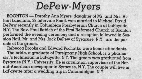 Michael David DePew were married in 1980 in LaFayette, Onondaga, New York, USA.