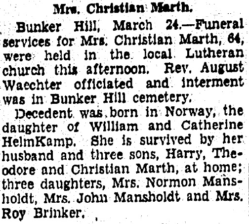 Christian John Marth were married in 1893. She died on March 24, 1936, at age 64, in Bunker Hill, Macoupin, Illinois, USA. She was buried in Bunker Hill Cemetery, Bunker Hill, Illinois.