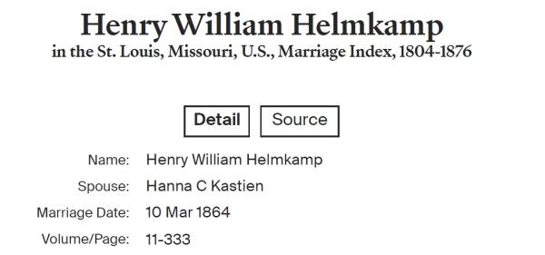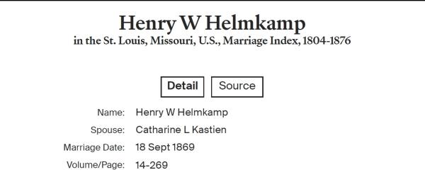 Heinrich Wilhelm Helmkamp were married on September 18, 1869 in St. Louis, Missouri, USA. She and