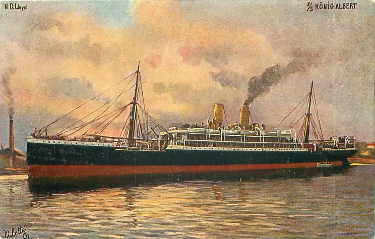 The S.S. Konig Albert was built by A.G. Vulcan in 1899 for North German Lloyd. She was launched on June 24th 1899 and celebrated her maiden voyage from Hamburg to the Far East. On April 16th, she went to the Genoa, Naples, New York service and stayed on that route until 1914. During the Great War, she took shelter in Italy but was seized by Italy in March 1915. At this time, the ship was renamed Ferdinando Palasciano and was mostly used as a hospital ship. In 1920, the vessel was transferred to the Navigazione Generale Italiana line continued the Genoa, Naples, New York service. In 1922, she was renamed Italia and was mostly used as a exhibition ship. In 1926, the Konig Albert was scrapped in Italy.