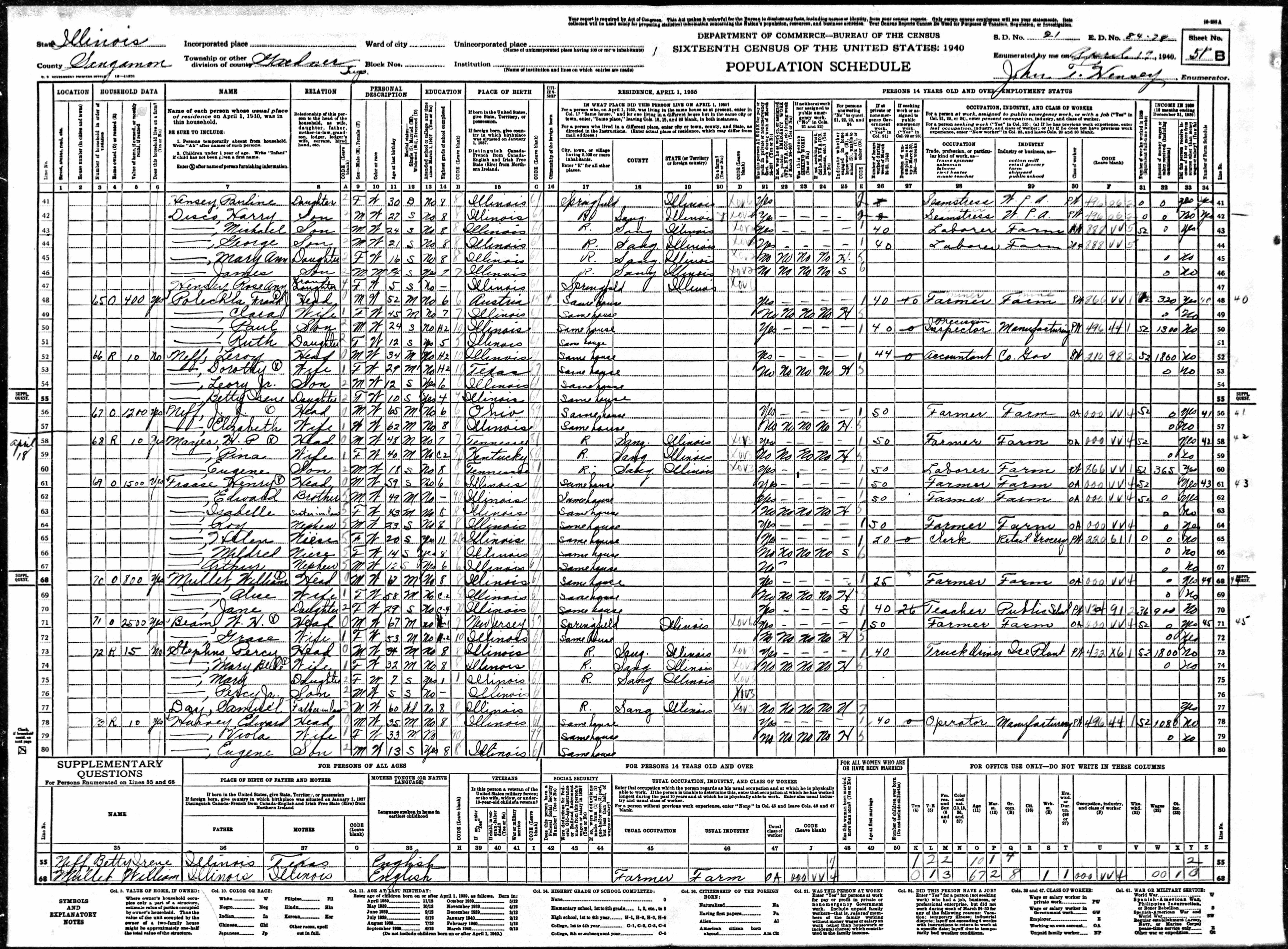 Fraase Family 1940 Federal Census, Illinois, Lines 61-67