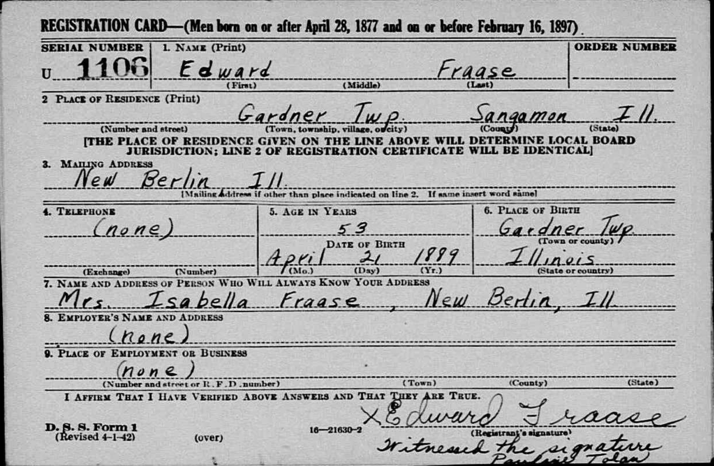 Edward Fraase was born on April 21, 1896 in Illinois, USA. He and