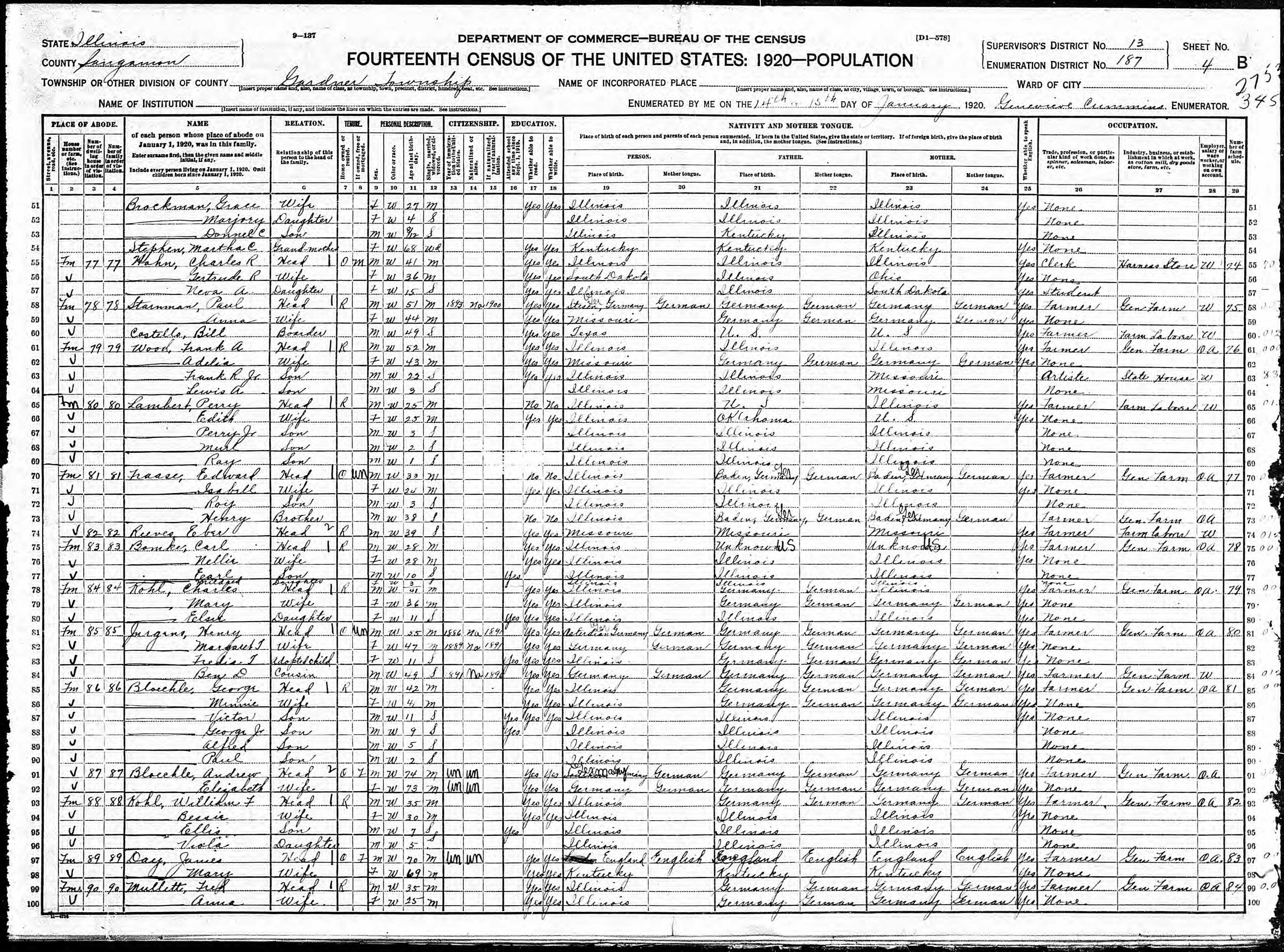 Fraase Family 1920 Federal Census, Illinois, Lines 70-73