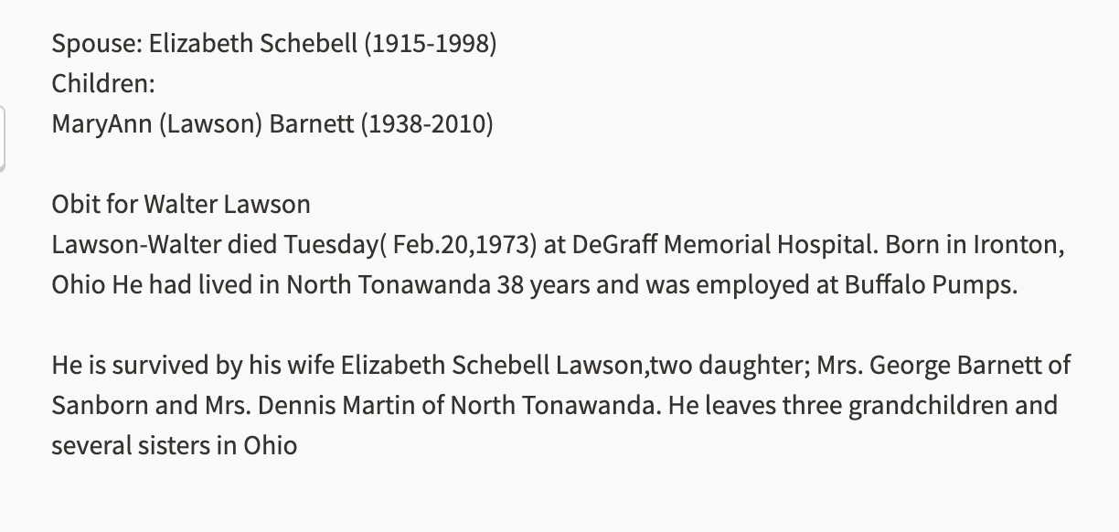 Walter Lawson were married. She died on June 10, 1998, at age 82, in North Tonawanda, Niagara, New York, USA. She was buried in Acacia Park Cemetery, North Tonawanda, New York.