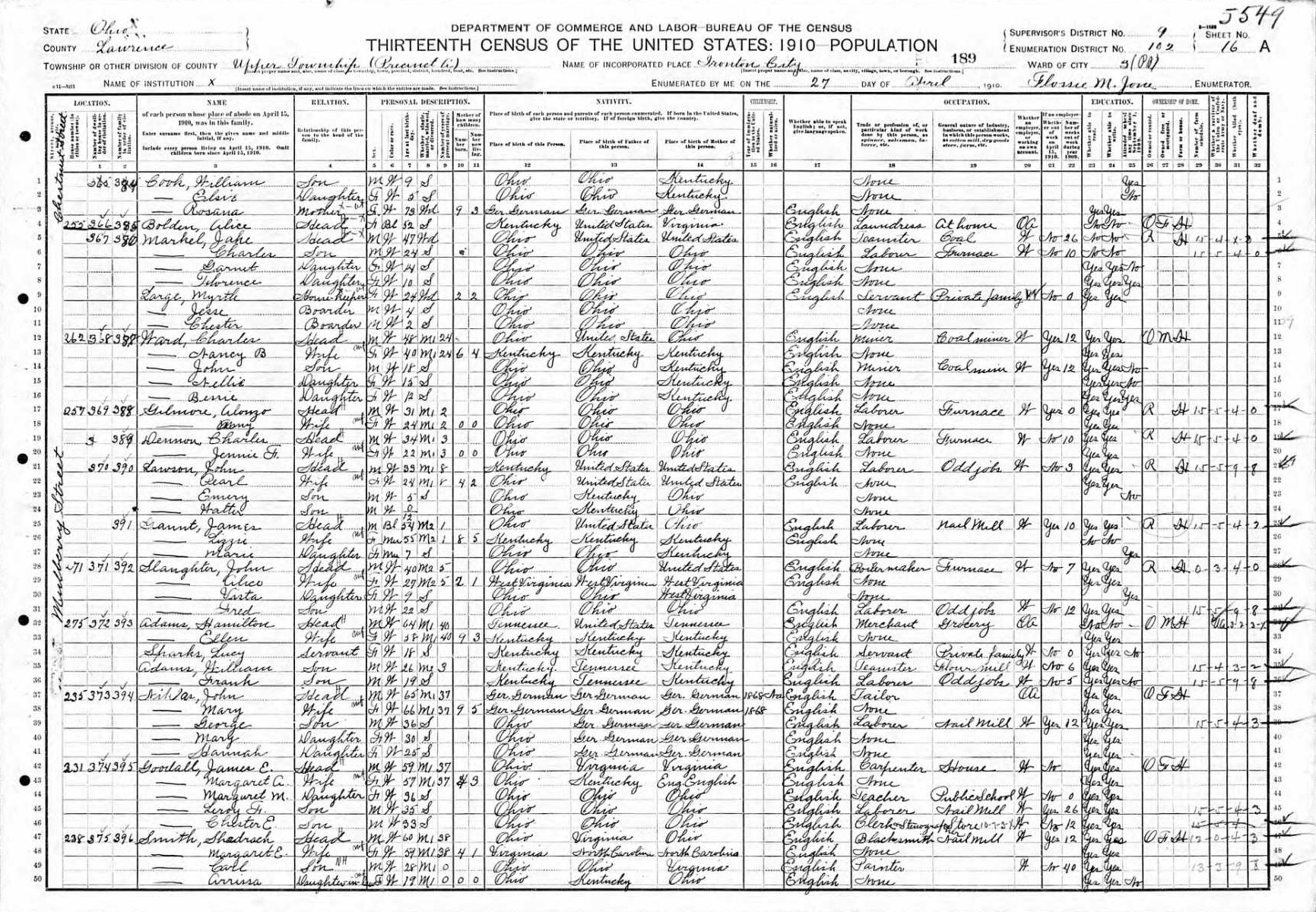 Lawson Family 1910 Federal Census Ohio, Lines 21-24