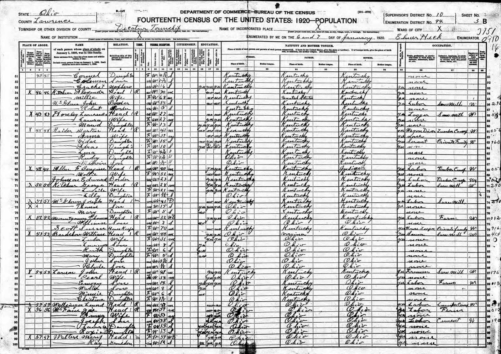 Lawson Family 1920 Federal Census Ohio, Lines 87-92