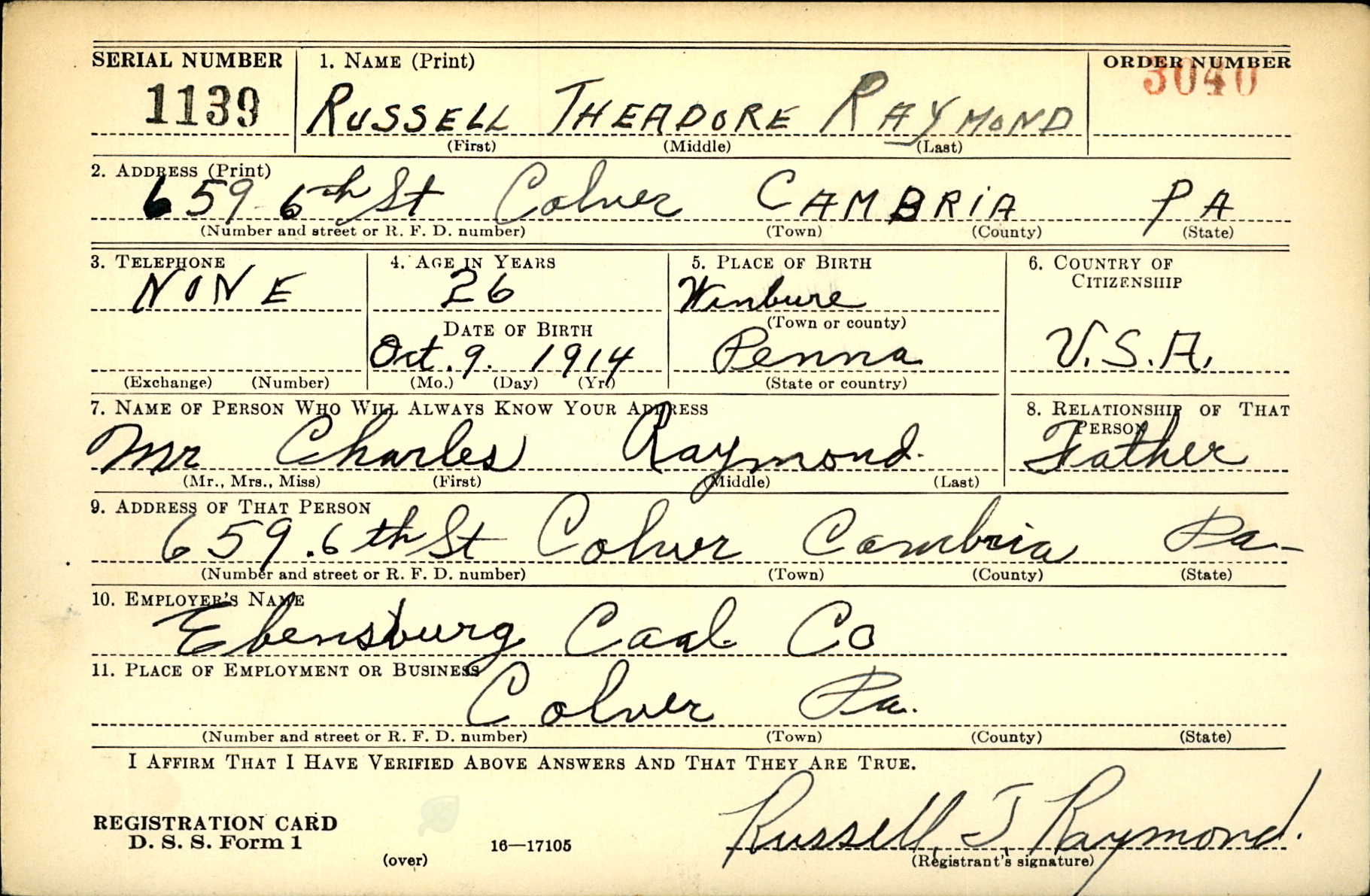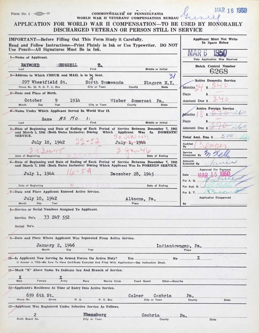 Russell Theodore "Bud" Raymond was born on October 9, 1914 in Winber, Somerset, Pennsylvania, USA. He and
