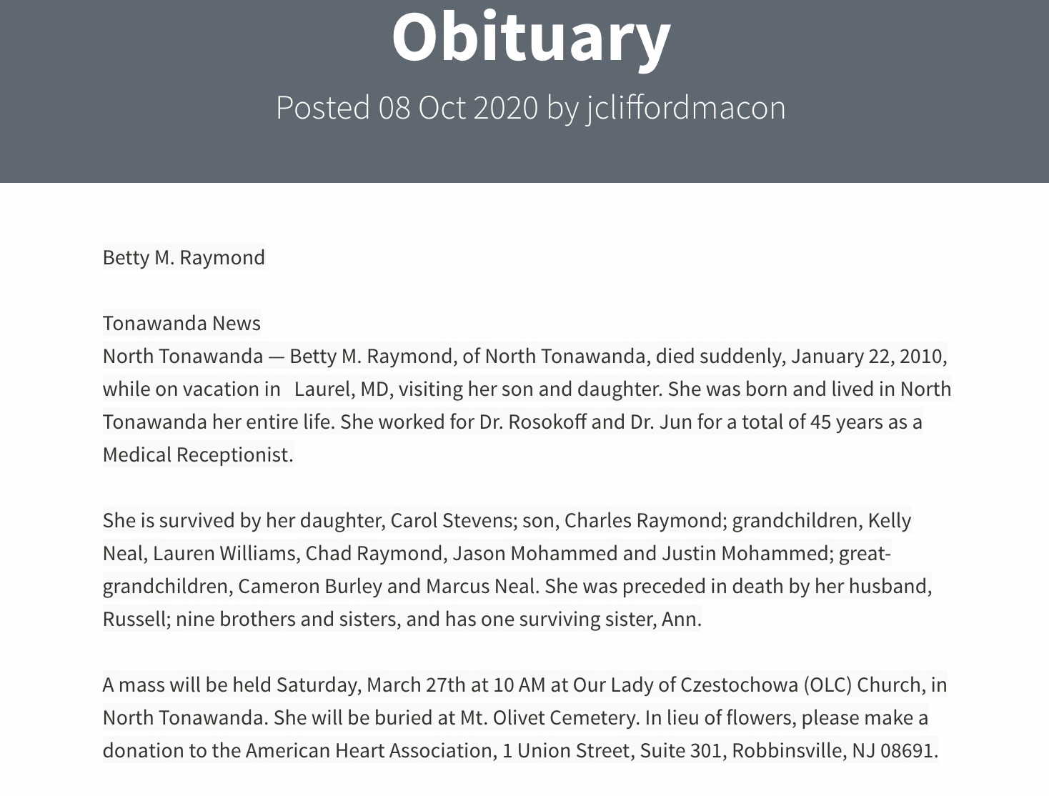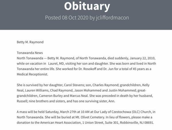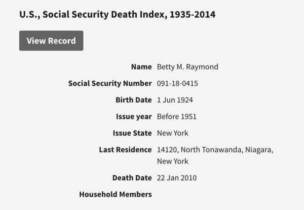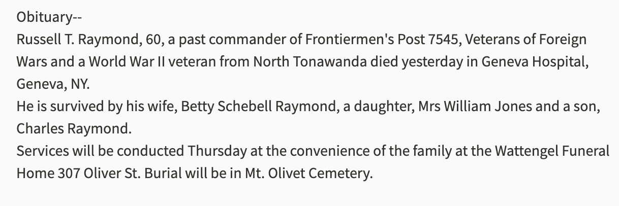 Russell Theodore "Bud" Raymond were married on February 15, 1947 in North Tonawanda, Niagara, New York, USA. She died on January 22, 2010, at age 85, in Laurel, Prince George's, Maryland, USA. She was buried in Mount Olivet Cemetery, Kenmore, New York.