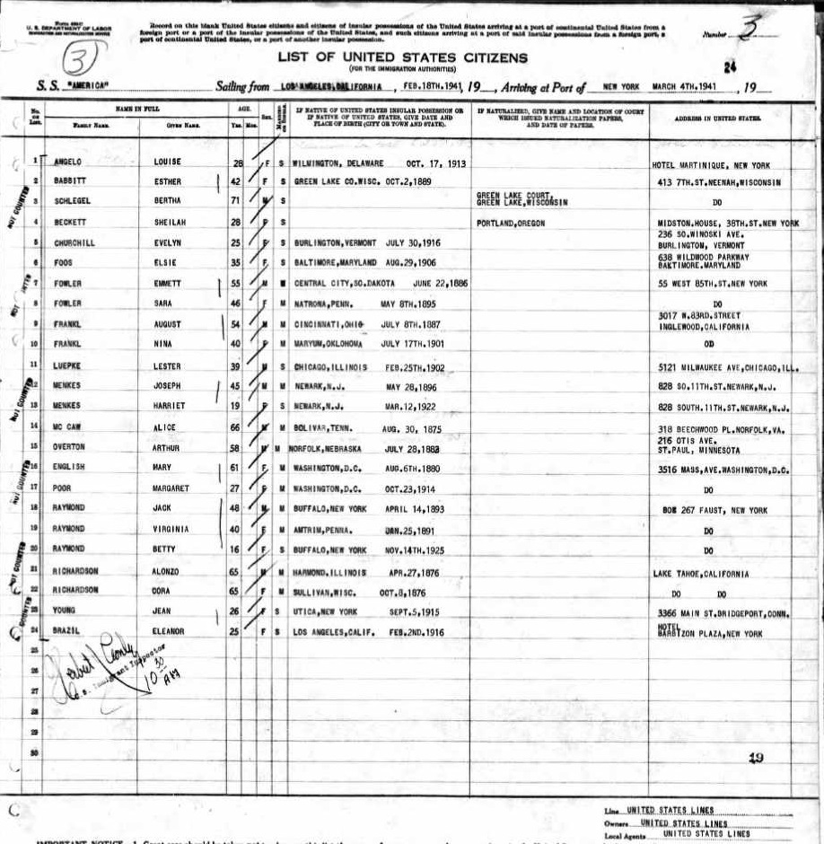 1941 Ship Departure Manifest, Line 20