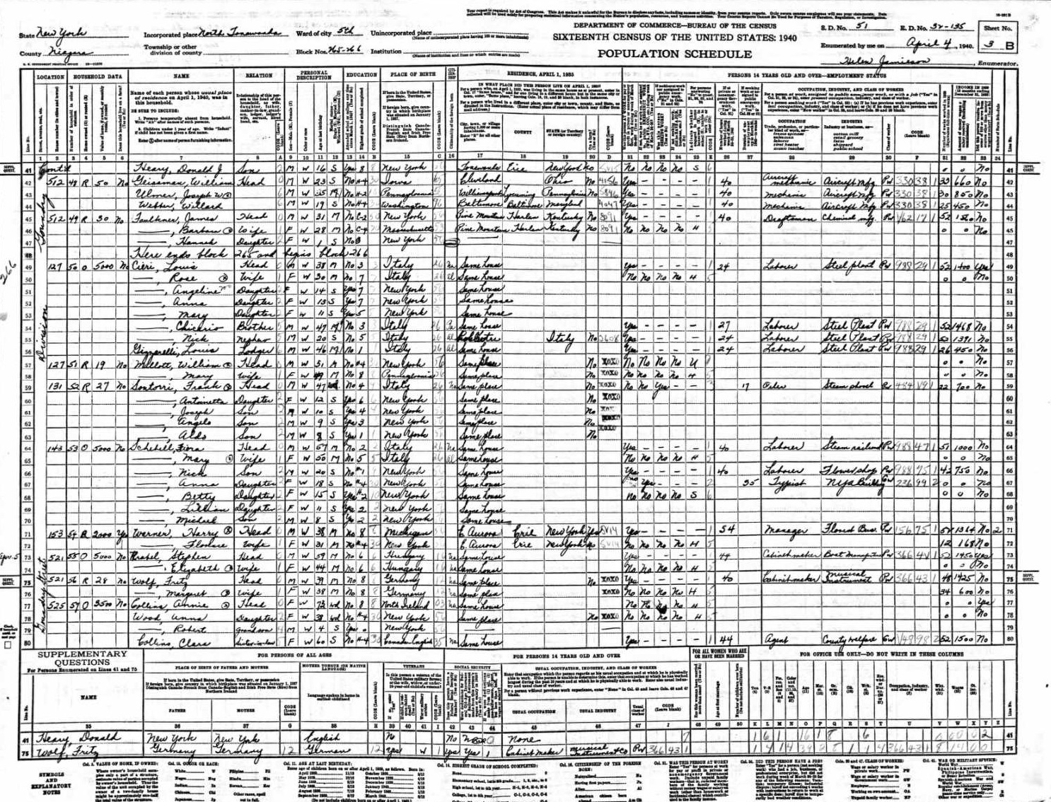 Scibelli Family 1940 Federal Census New York, Lines 64-70