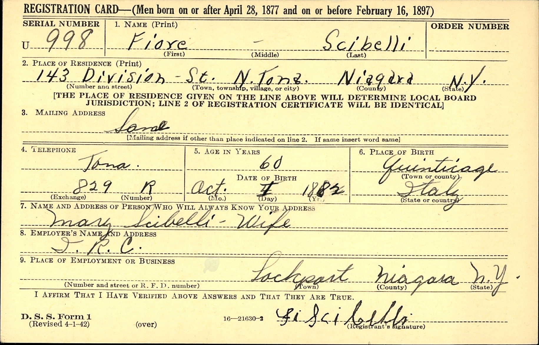 Elizabeth Scibelli (Schebell) were married. He died on February 20, 1973, at age 62, in North Tonawanda, Niagara, New York, USA. He was buried in Acacia Park Cemetery, North Tonawanda, New York.