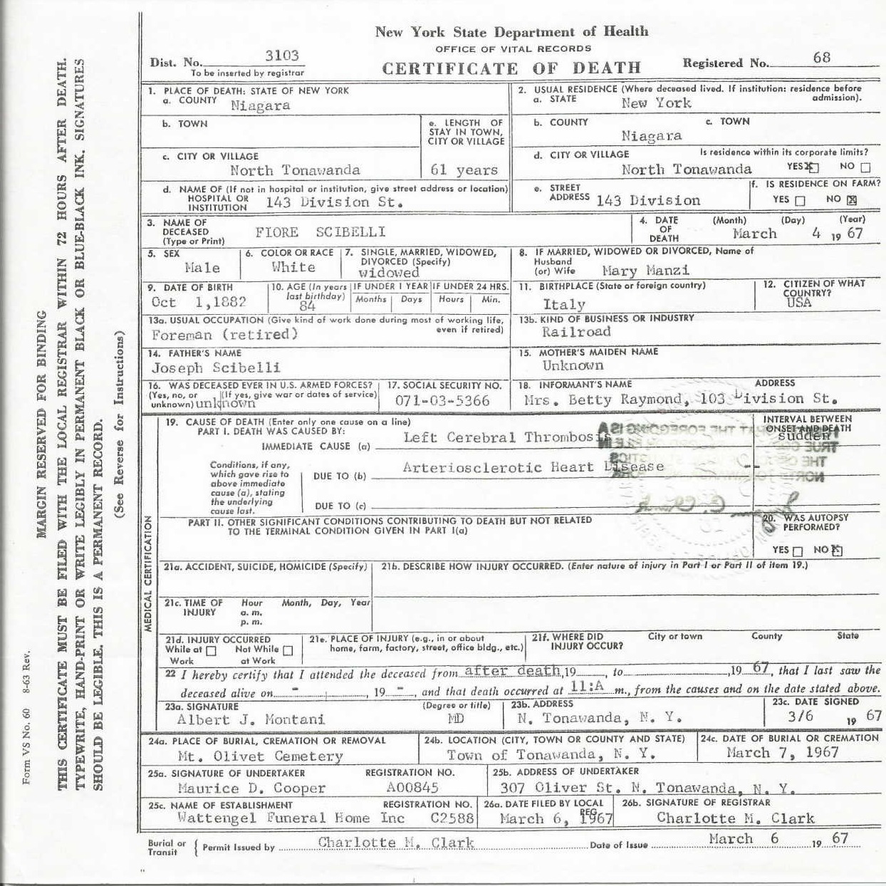 Maria Grace "Mary" Manzi were married on April 14, 1907 in Linwood, Genesee, New York, USA. He died on March 4, 1967, at age 84, in North Tonawanda, Niagara, New York, USA. He was buried in Mount Olivet Cemetery, Kenmore, New York.