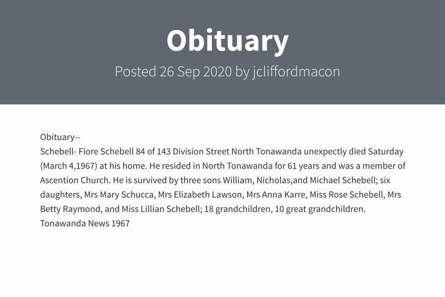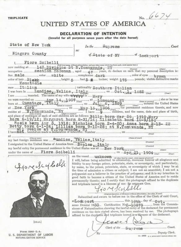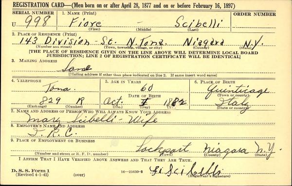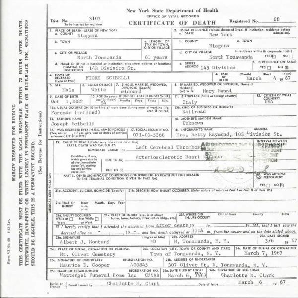 Fiore "William" Scibelli (Schebell) were married on April 14, 1907 in Linwood, Genesee, New York, USA. She died on June 6, 1947, at age 57, in North Tonawanda, Niagara, New York, USA. She was buried in Mount Olivet Cemetery, Kenmore, New York.