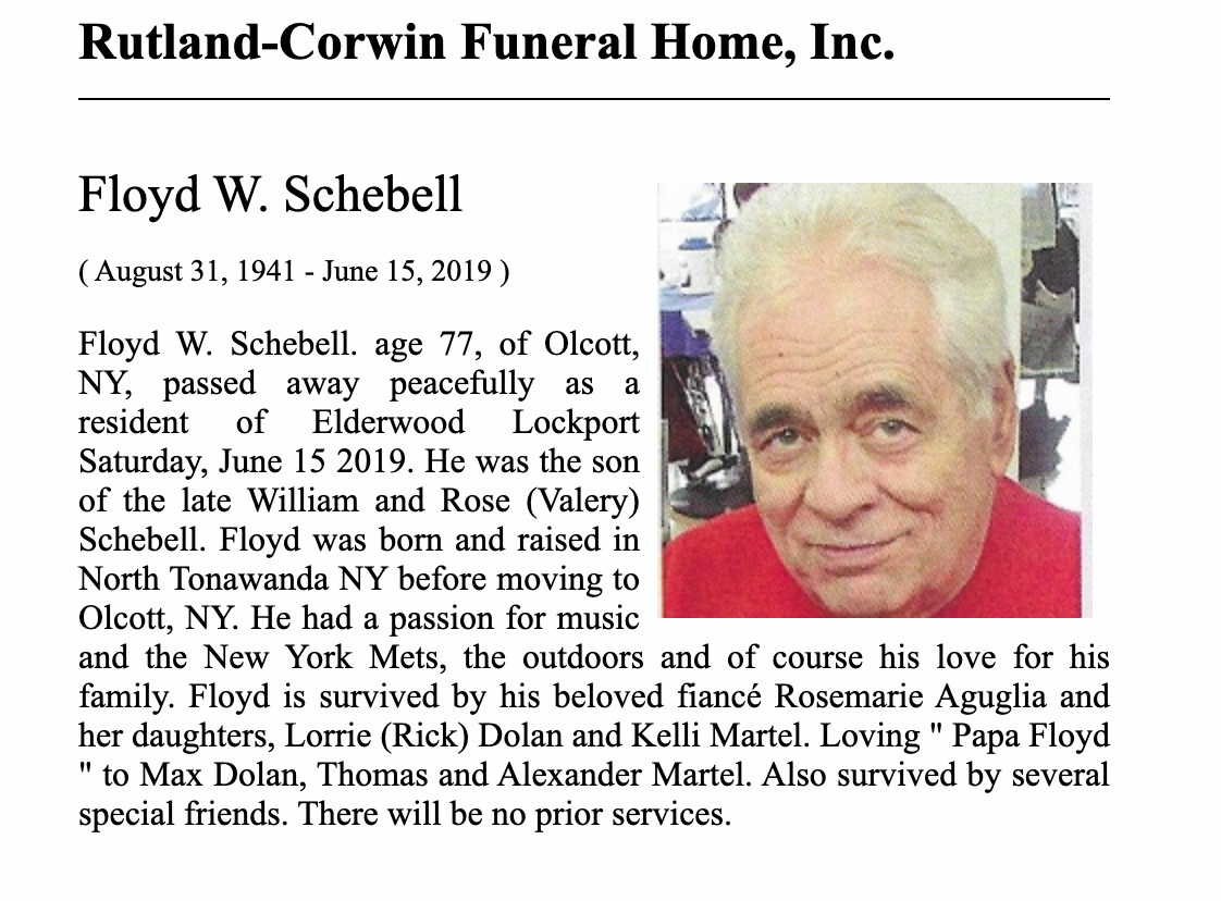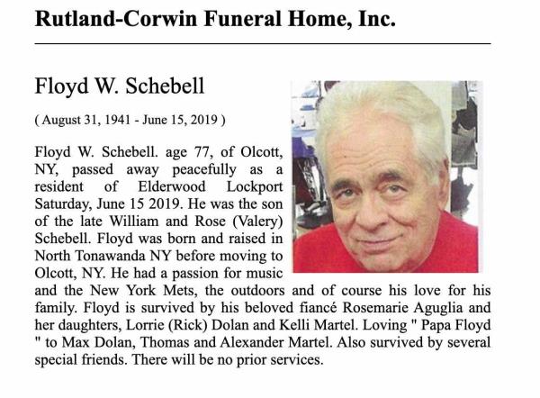 Floyd W. Scibelli (Schebell) was born on August 31, 1941 in North Tonawanda, Niagara, New York, USA. He died on June 15, 2019, at age 77, in Lockport, Niagara, New York, USA.