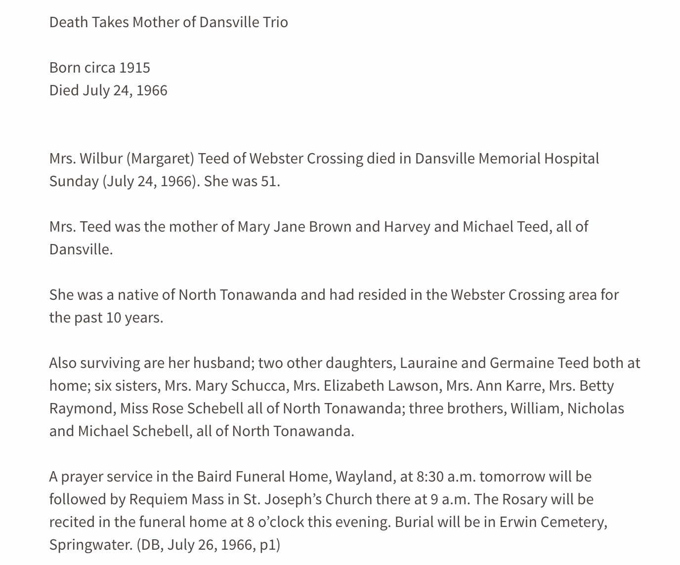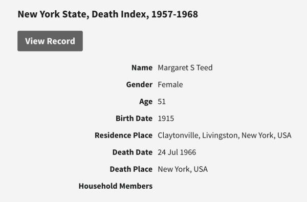 Wilbur Fred Teed were married on June 18, 1938 in North Tonawanda, Niagara, New York, USA. She died on July 24, 1966, at age 51, in Dansville, Livingston, New York, USA. She was buried in Erwin Cemetery, Springwater, New York.