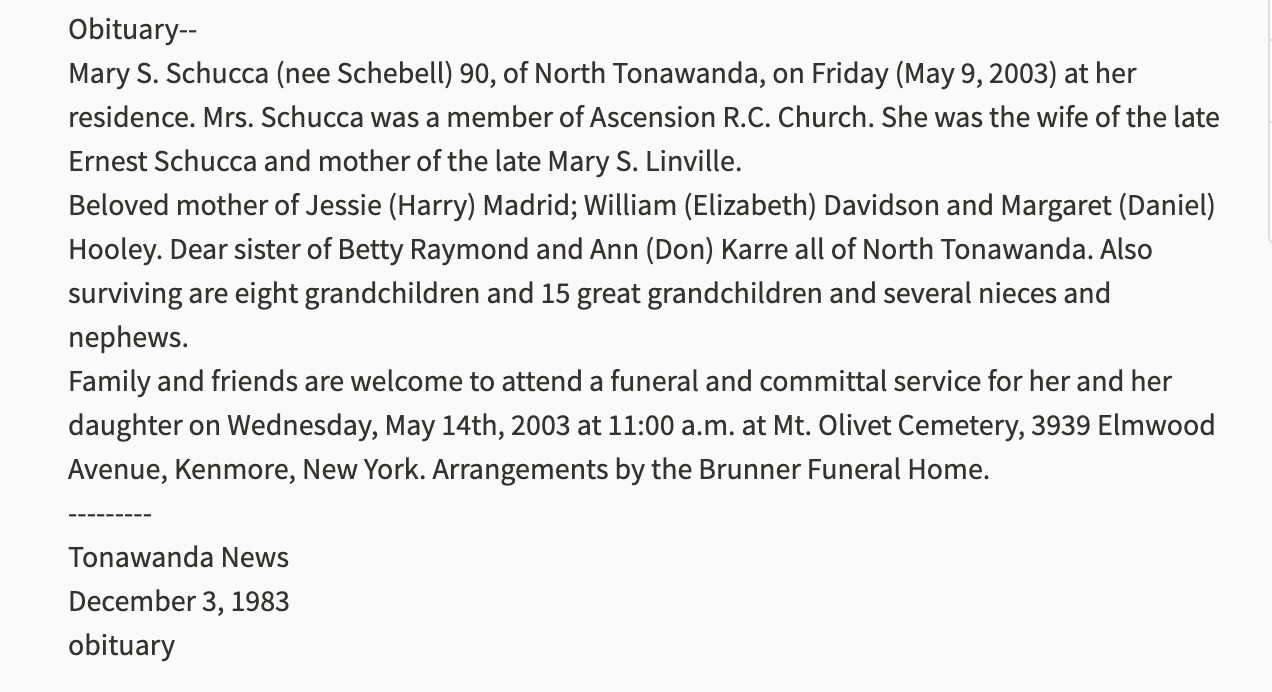 Ernest Della Schucca were married on December 18, 1945 in North Tonawanda, Niagara, New York, USA. She died on May 9, 2003, at age 90, in North Tonawanda, Niagara, New York, USA. She was buried in Mount Olivet Cemetery, Kenmore, New York.