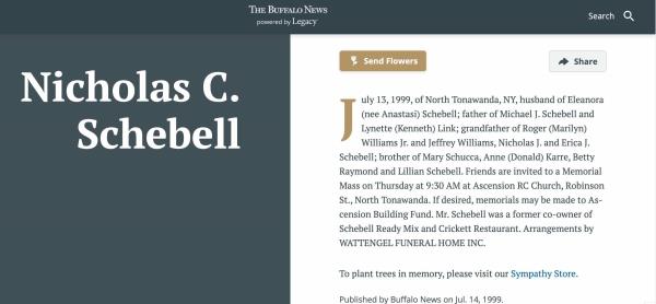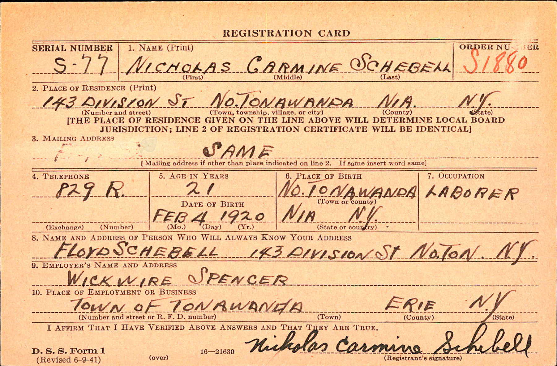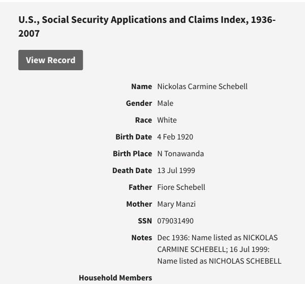 Nicholas Carmine Scibelli (Schebell) was born on February 4, 1920 in North Tonawanda, Niagara, New York, USA. He and