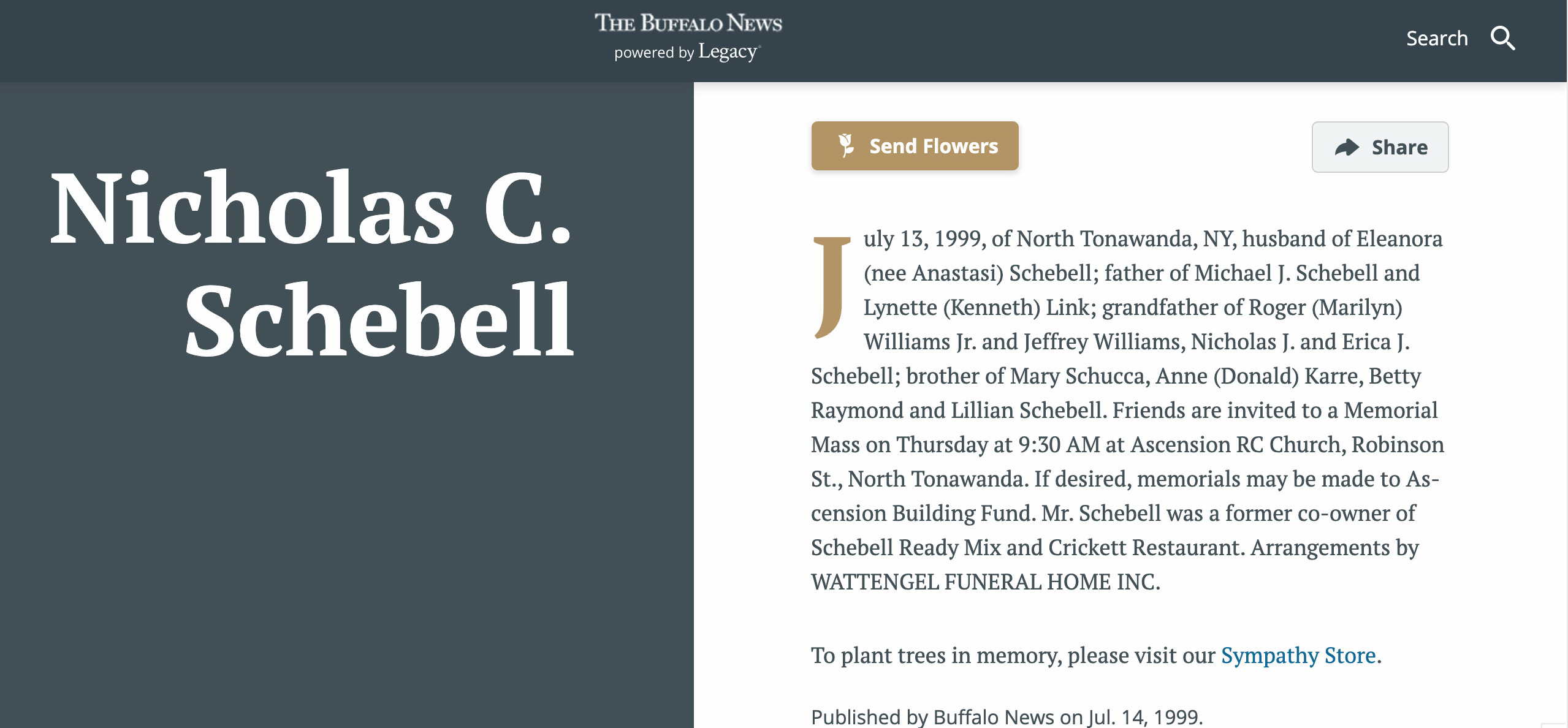 Betty M. Scibelli (Schebell) were married on February 15, 1947 in North Tonawanda, Niagara, New York, USA. He died on April 20, 1975, at age 60, in Geneva, Ontario, New York, USA. He was buried in Mount Olivet Cemetery, Kenmore, New York.