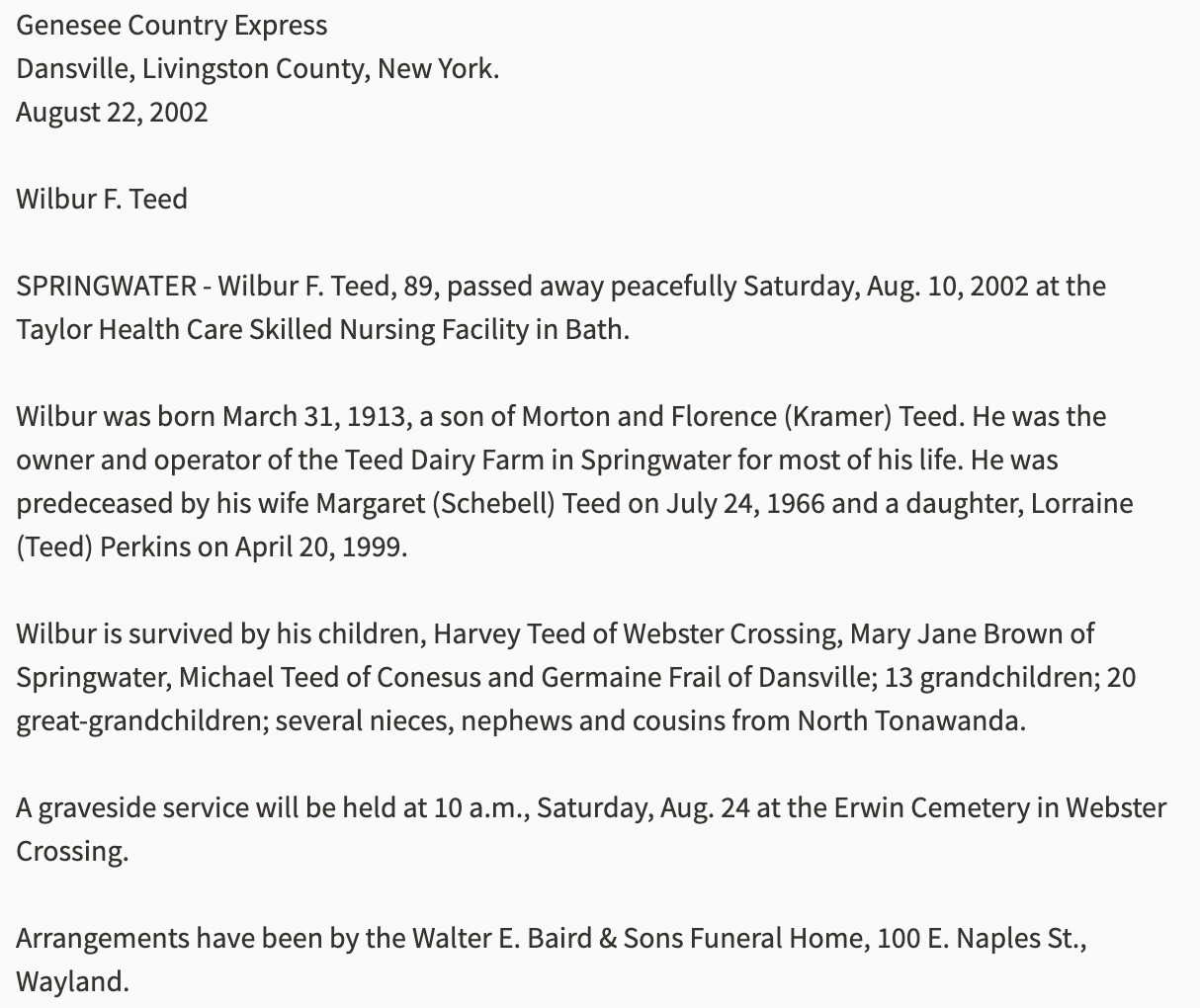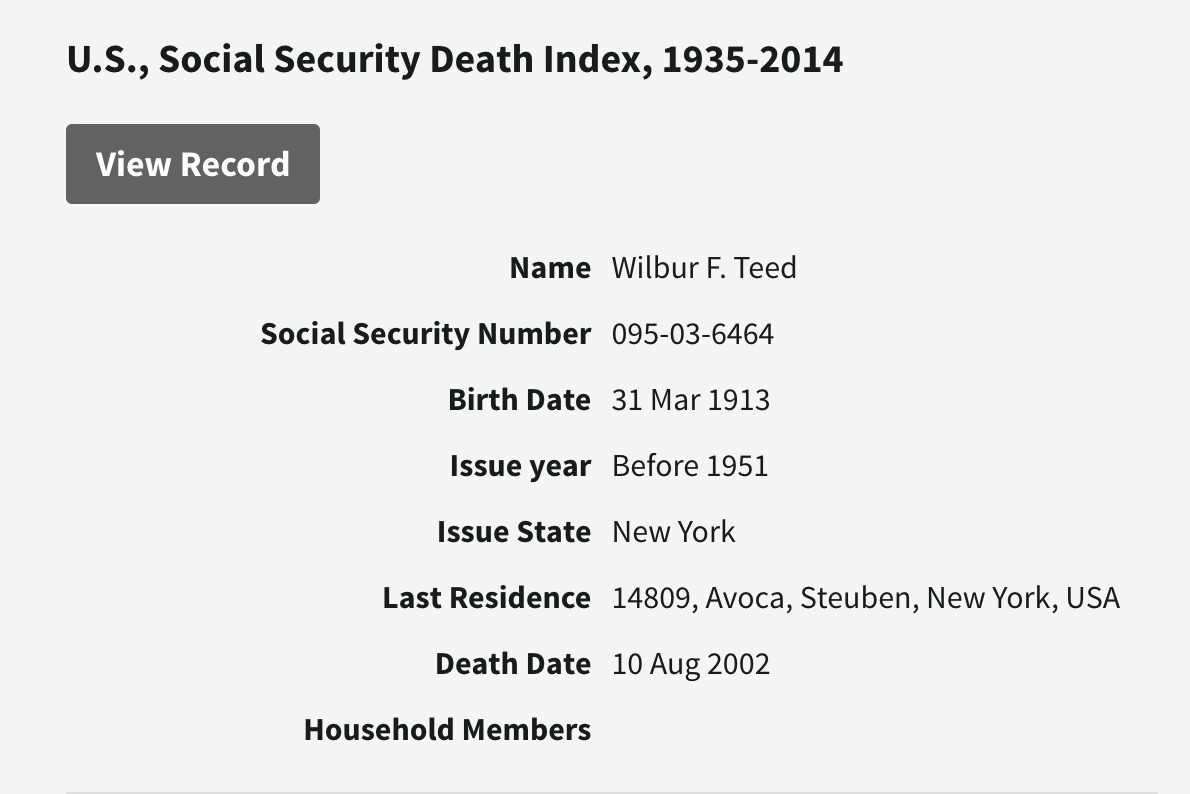 Wilbur Fred Teed was born on March 31, 1913 in Springwater, Livingston, New York, USA. He and