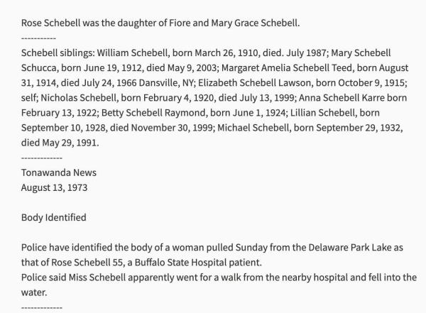 Rose Scibelli (Schebell) was born on April 4, 1918 in North Tonawanda, Niagara, New York, USA. She died on August 13, 1973, at age 55, in Buffalo, Erie, New York, USA. She was buried in Mount Olivet Cemetery, Kenmore, New York.