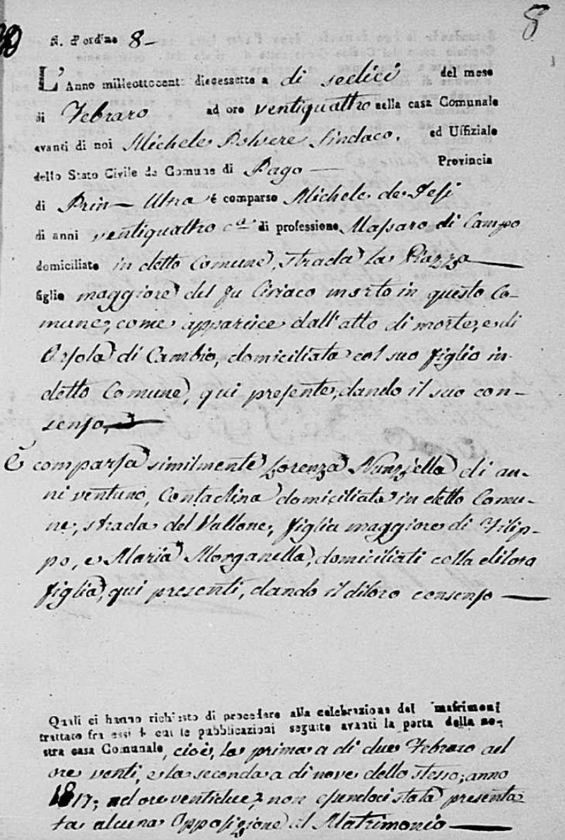 Lorenza Nunziella were married on February 16, 1817 in Pago Veiano, Benevento, Campania, Italy. He and