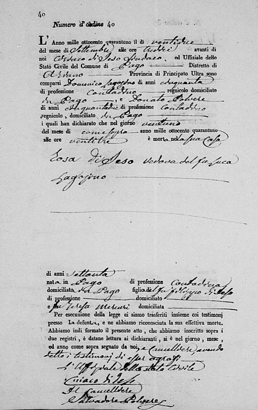Luca Lagozino were married. She died on September 21, 1841, at age ~70, in Pago Veiano, Benevento, Campania, Italy.