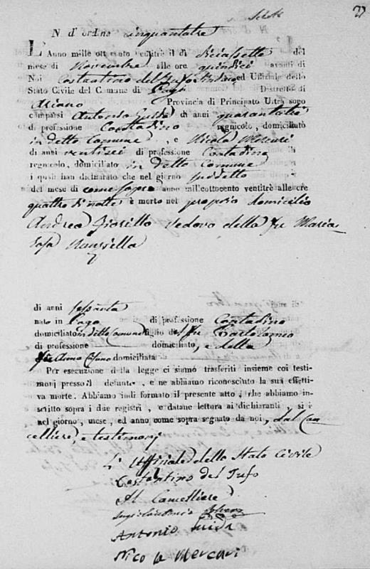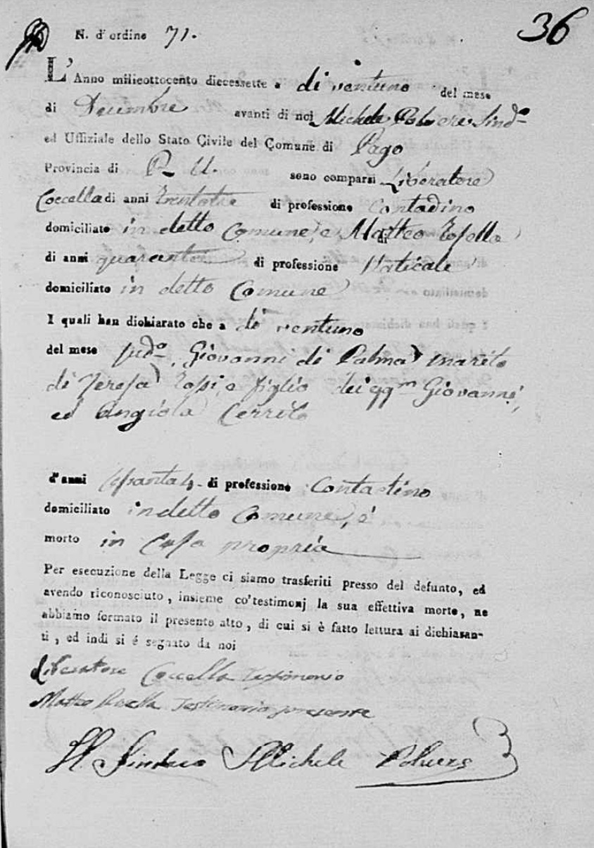 Mariarosa Nunziella were married. He died on November 17, 1823, at age ~60, in Pago Veiano, Benevento, Campania, Italy.