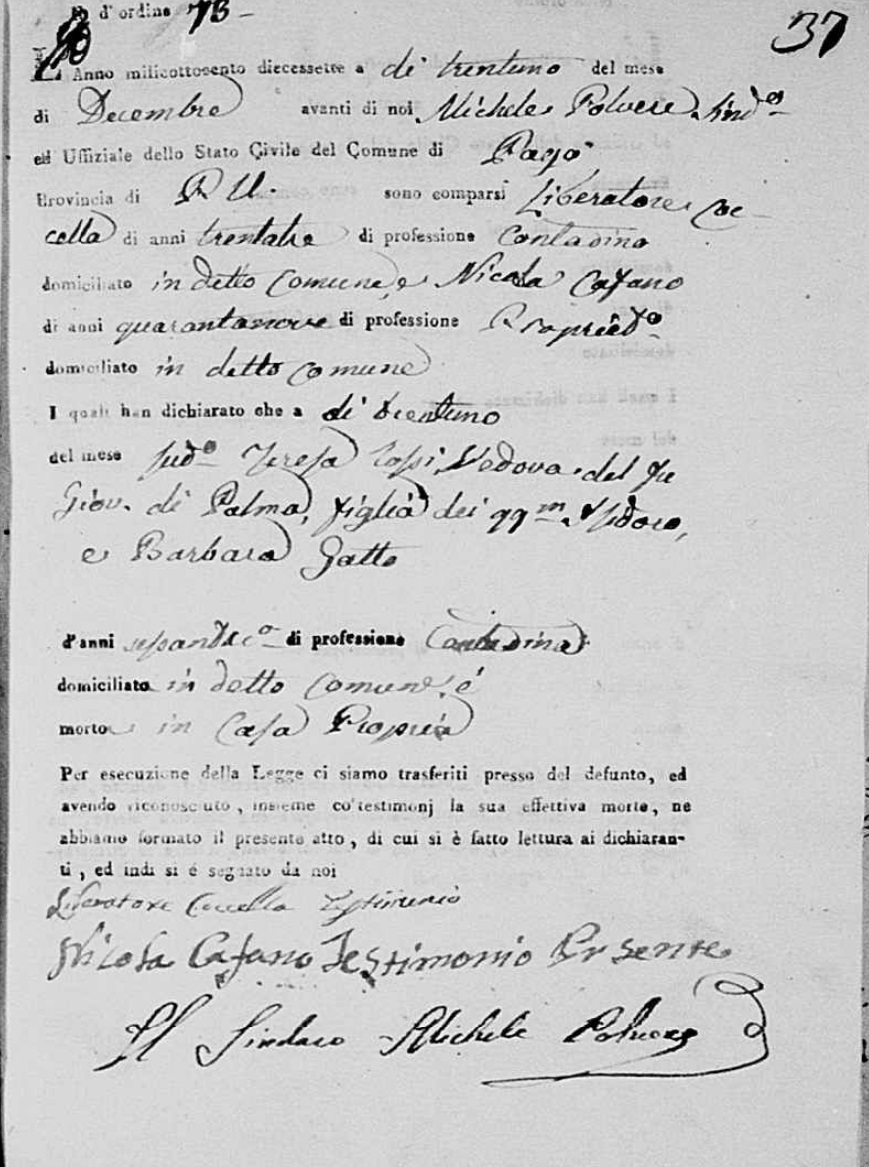 Mariateresa Conte were married. He died on October 19, 1818, at age ~59, in Pago Veiano, Benevento, Campania, Italy.